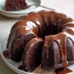 Store the vegan Bundt cake in an airtight container at room temperature for 3 to 4 days. Keep the chocolate ganache-covered cake refrigerated if your kitchen is warm, returning it to room temperature before serving. The ganache can also be stored separately in the refrigerator for 2 to 3 days; warm gently before using if it solidifies.