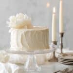 A two-layer cake sits on a clear glass cake stand. The cake is covered in smooth, creamy white frosting with soft swirling patterns. A large, delicate white flower decoration is placed on the side where the two cake layers meet. In the background, two tall white candles in metal holders are lit, adding a warm tone to the scene. The cake and accessories rest on a white marbled surface with white cloth napkins nearby, and a stack of white plates with silver forks is placed to the right. photo taken with an iphone --ar 4:5 --v 7